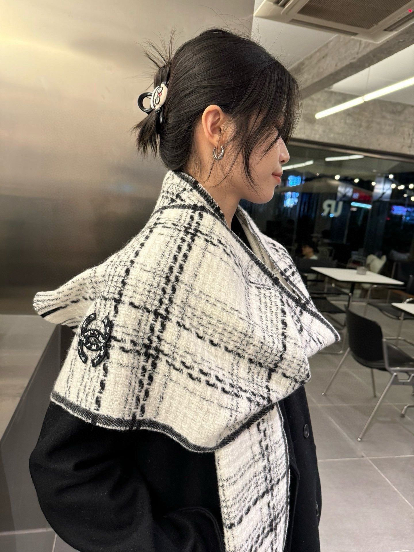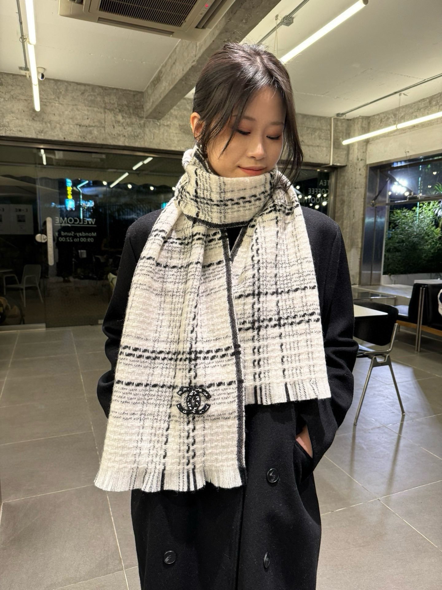 Chanel classic black and white checkered 100% wool scarf Size: 32*186cm
